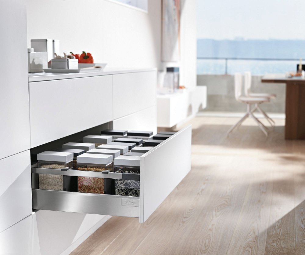 Ящик TANDEMBOX antaro отличает простой язык форм независимо от того, какой это ящик: с прямоугольным релингом или вставками. Все комплектующие выполнены в единой цветовой гамме, что еще больше подчеркивает строгий дизайн изделия.